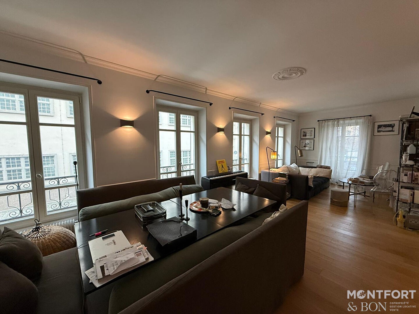 Cet appartement de 75.19 m² situé au 1er étage comprend : une entrée, un double séjour, une cuisine aménagée, deux chambres, une salle de bains, une salle d'eau et un WC.